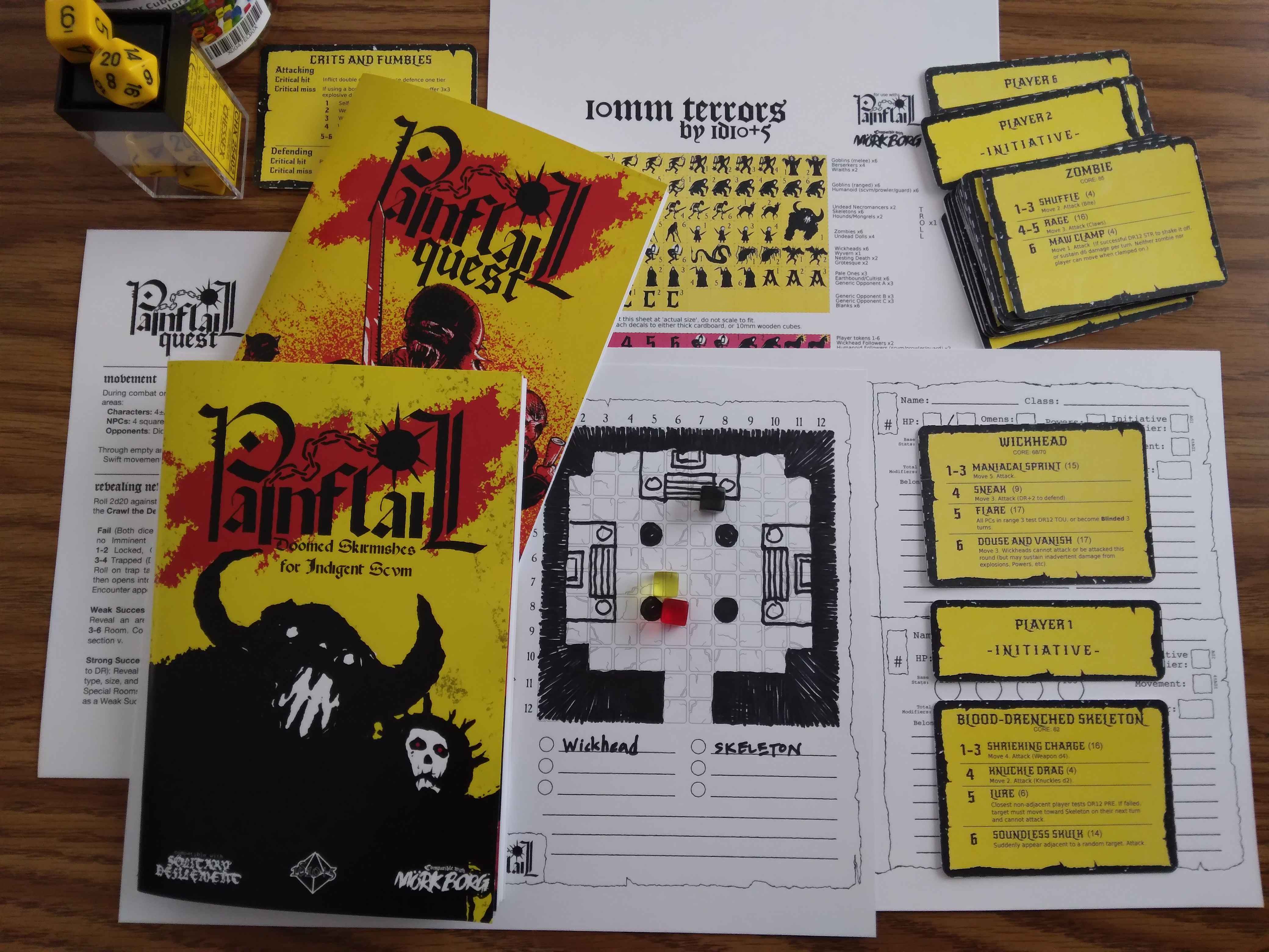 PAINFLAIL QUEST takes the things further, with dungeon-crawling procedures compatible with the SÖLITARY DEFILEMENT crawl-system or usable simply with MÖRK BORG. Take a party of four unsuspecting victims on a jaunt beneath the surface of the Dying World: just add 10mm counters, 25mm standees (included in the download), or whatever you can find to symbolise your players and other beasties.
